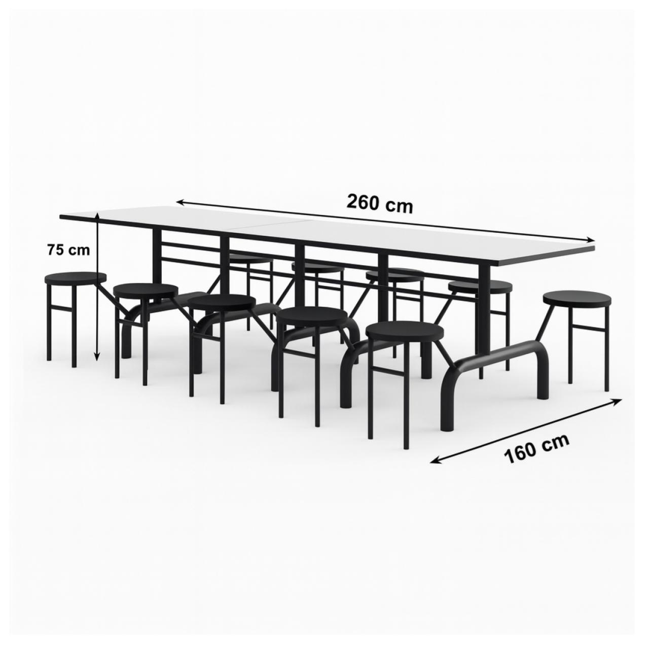 Mesa para Refeitório ESCAMOTEÁVEL 10 Lugares MDP Branco de 25 mm – Assento PRETO – 50903