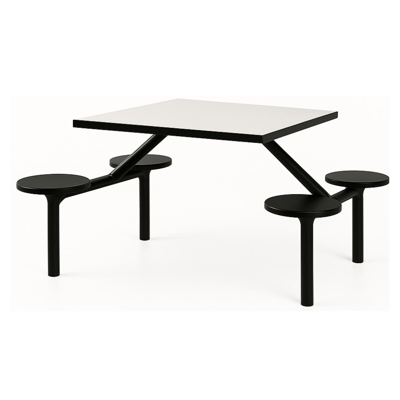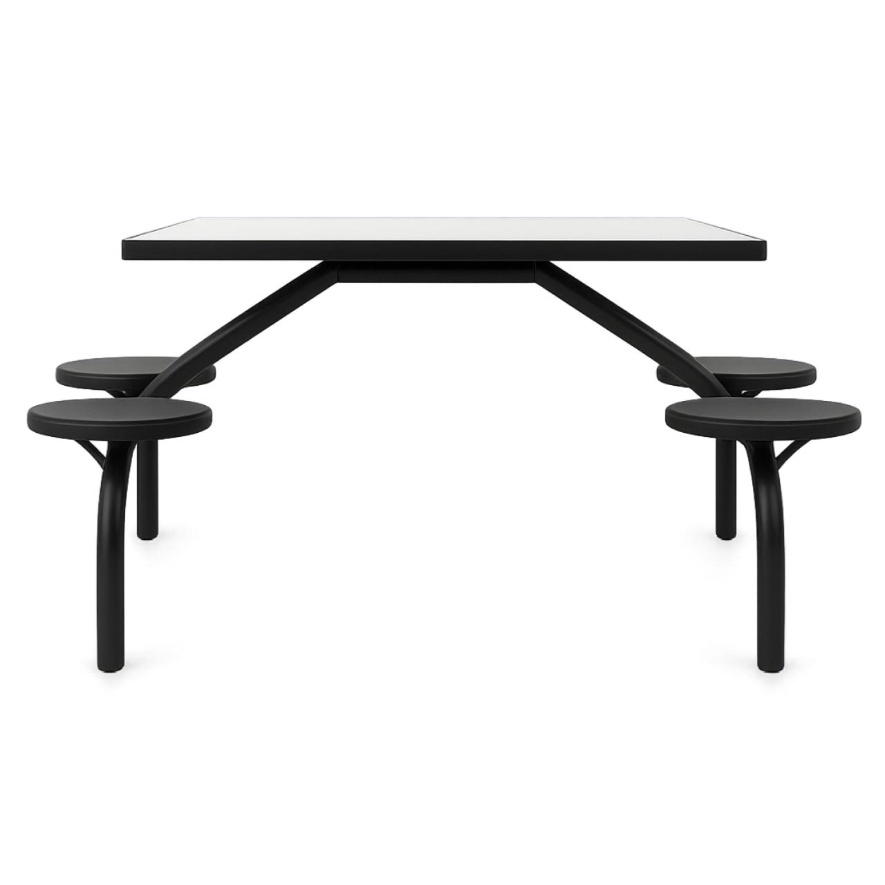 Quatro assentos circulares fixos em polipropileno injetado de alta densidade.