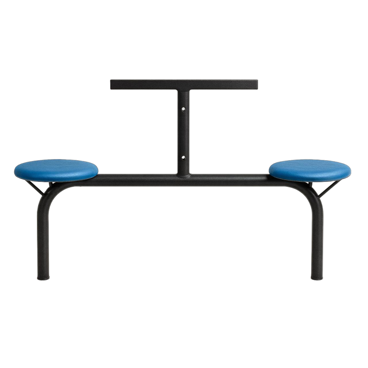 Oito assentos circulares fixos em polipropileno injetado de alta densidade.
